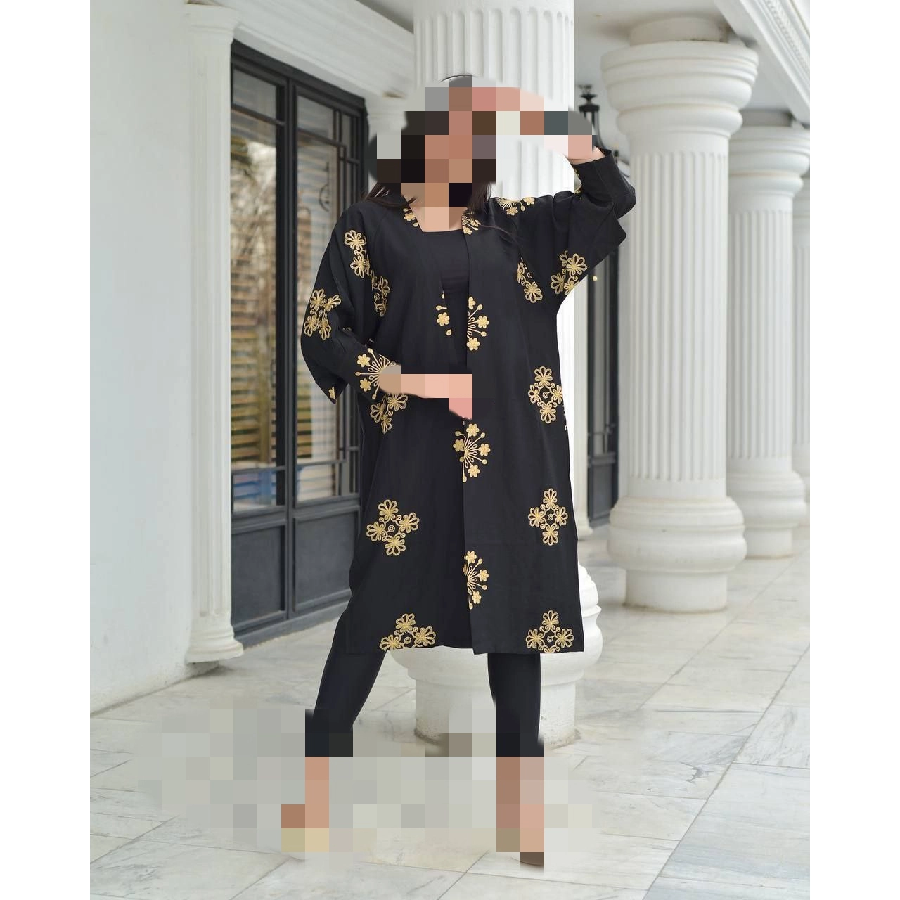 مانتو خامه دوزی بلند جنس کرسپو جلو باز قد ۱۱۰ فری سایز ۳۸ تا ۴۸